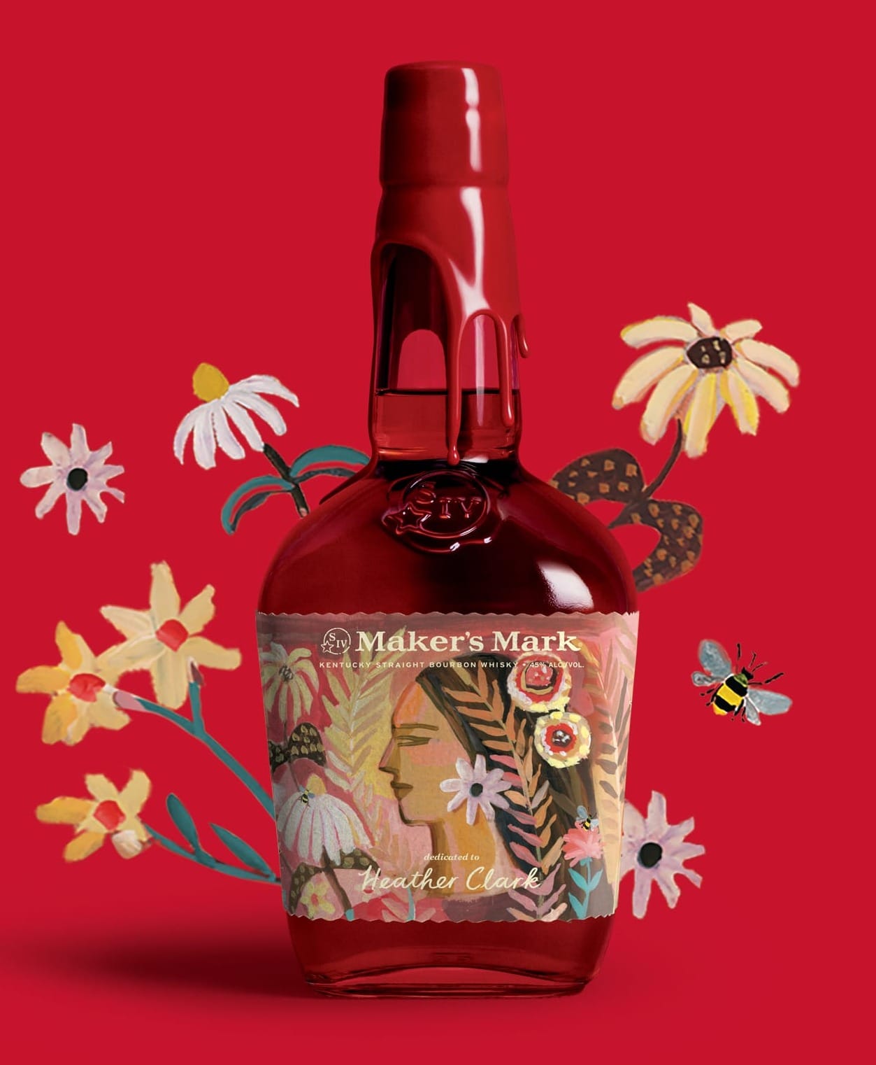 Gayle Kabaker, a longstanding partner of Vital Voices, has a history of creating art that showcases women who use their power to empower others and was inspired to illuminate the organization with Maker's Mark. Kabaker's limited-edition label depicts her interpretation of a spirited woman in acrylic gouache, inspired by the wildflowers of Kentucky and the colors of the Maker's Mark palette.