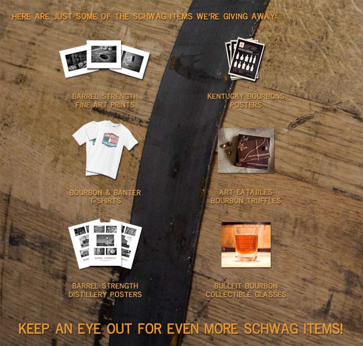 Bourbon Schwag is a collection of Bourbon-themed or Bourbon-related items that might include t-shirts, posters, photos, glasses, books, etc. The list of Bourbon Schwag available will vary as we get closer to our 1-year anniversary, but here are a few items we know will be included.