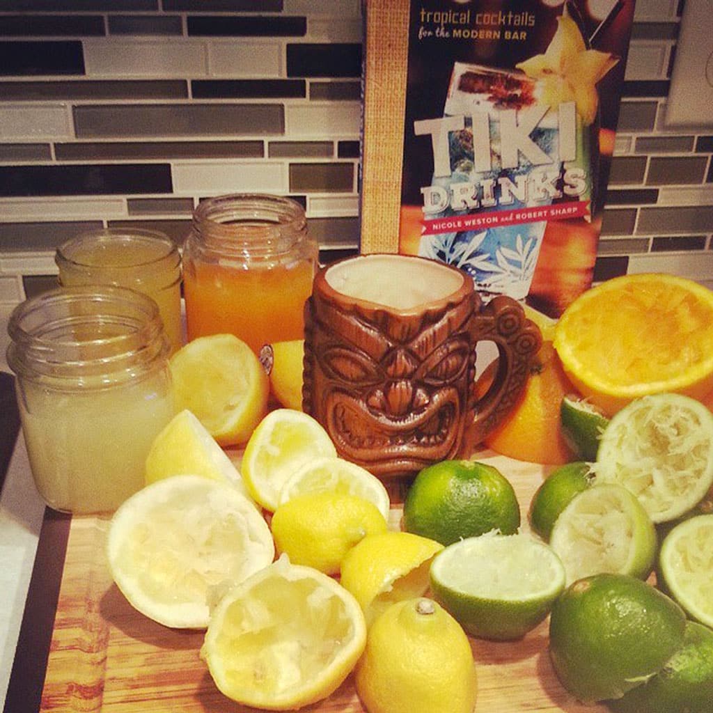 Joselyn: When the idea was presented, I loved it. Who would not want to spend the day drinking delicious tiki drinks? But after thumbing through the book, I quickly realized that this was a terrible idea. I hated it. Why? Because each drink had one million ingredients. Some of the ingredients were recipes (that’s right, a recipe for an INGREDIENT) and then the recipes for the ingredients, HAD MORE RECIPES. But being a (modern) woman of my word, I had to move forward.