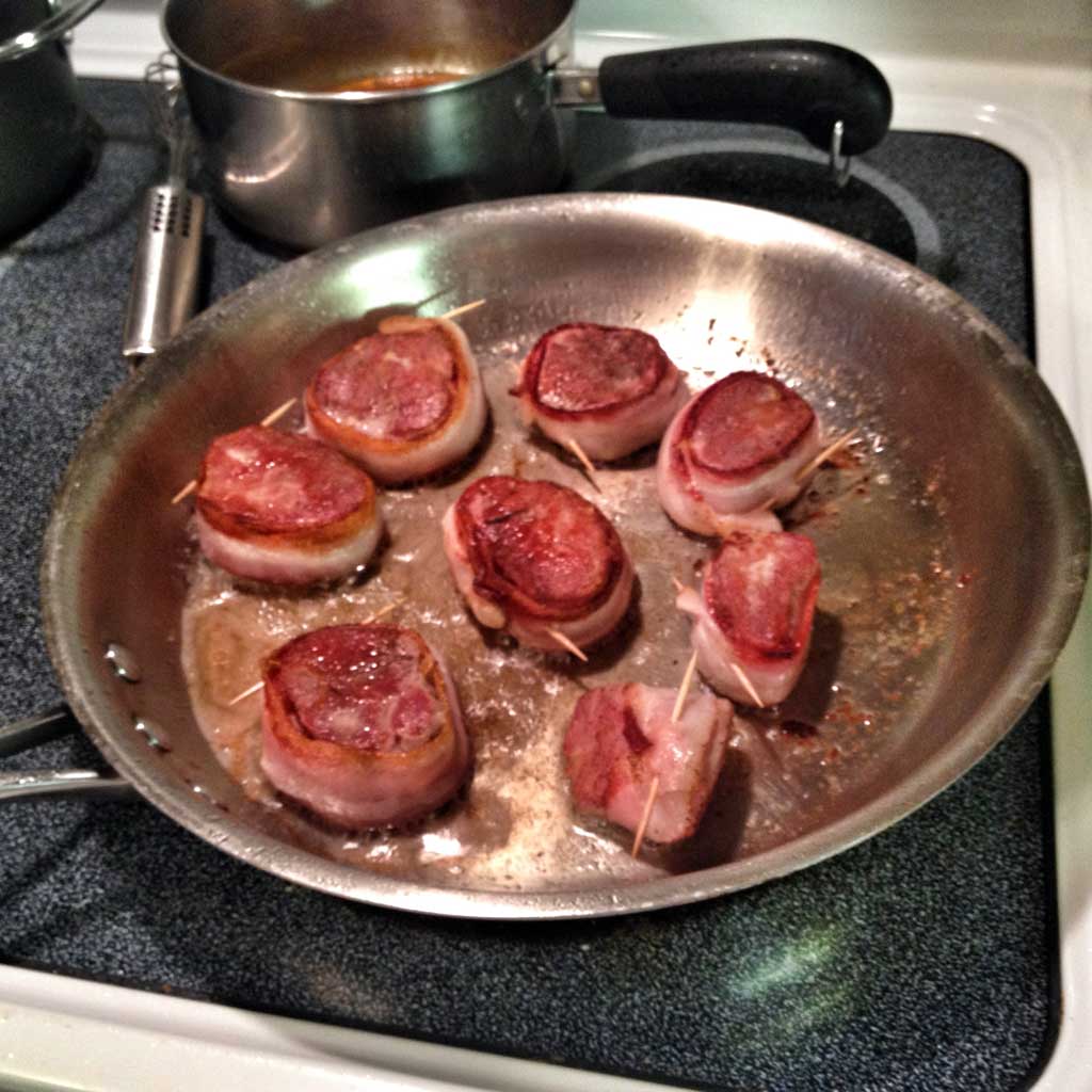 - Slice pork into 1.5 inch medallions and wrap with a piece of bacon. Secure with a toothpick.