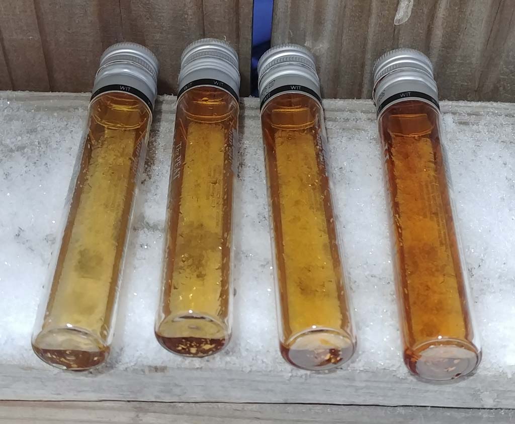 I decided it would be even more interesting to see what happened to whiskeys at various proofs. I grabbed a bottle each of Yahara Bay YB Whiskey (80°), Very Old Barton Bourbon (86°), Ezra B Single Barrel (99°), and Knob Creek Single Barrel (120°). I had some empty two-ounce bottles from a Compass Box sample kit and poured one ounce of each into the bottles. I considered an ounce of whiskey would be large enough to see what happens with the cold and the two-ounce bottle would give plenty of room should the whiskey expand in the bottle.