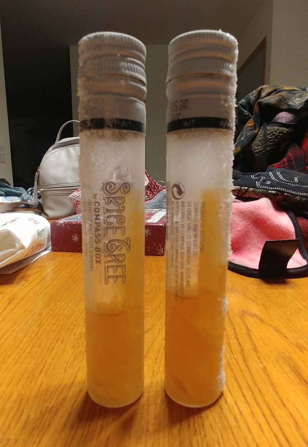 Then, at 8:45 am, magic happened. The real temperature was -25°F and the wind chill actually rose to -52°F. That one degree completely froze the 80° and 86° whiskeys. The 99° and 120° both remained normal as if they were in a room temperature home.