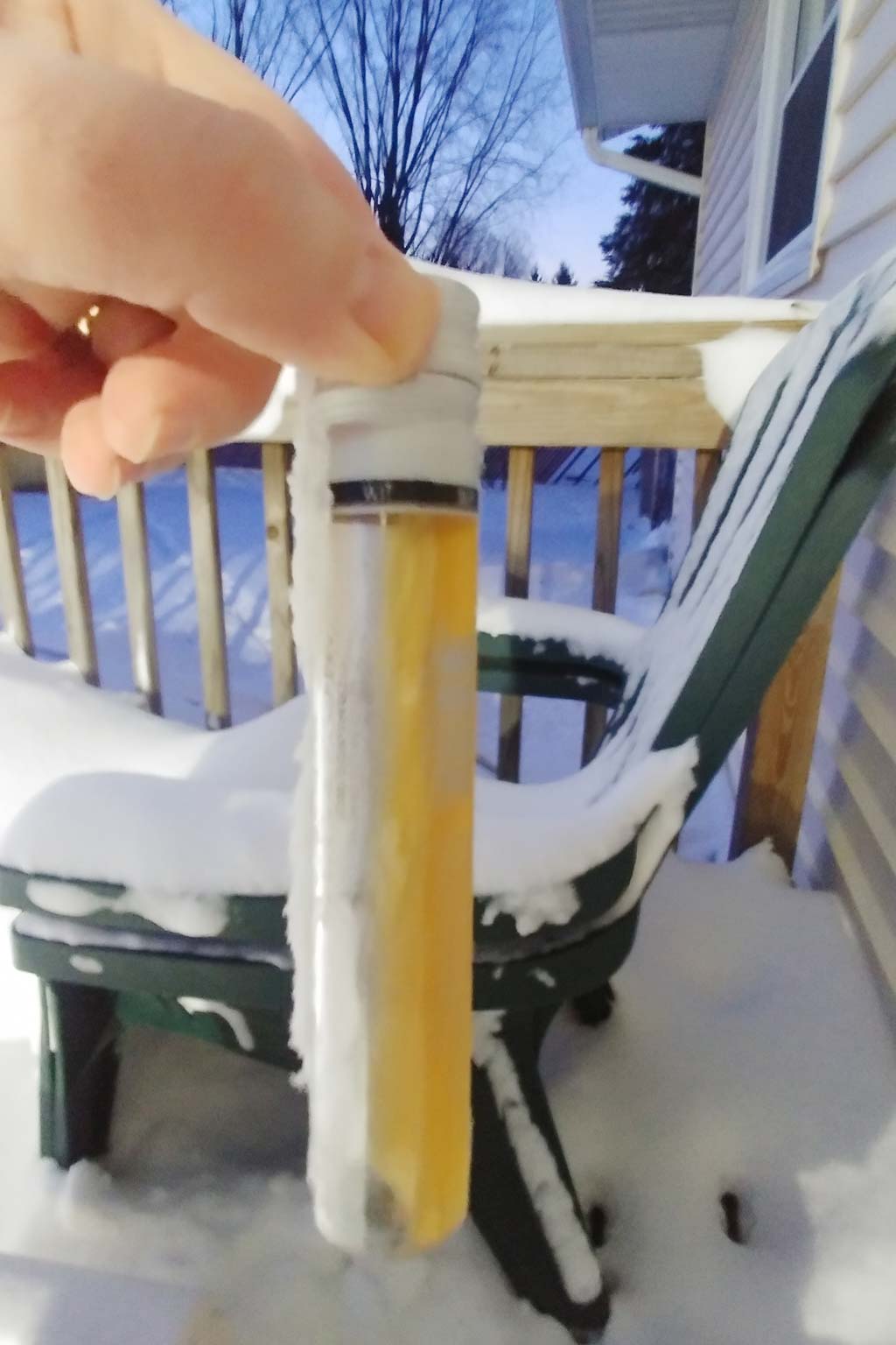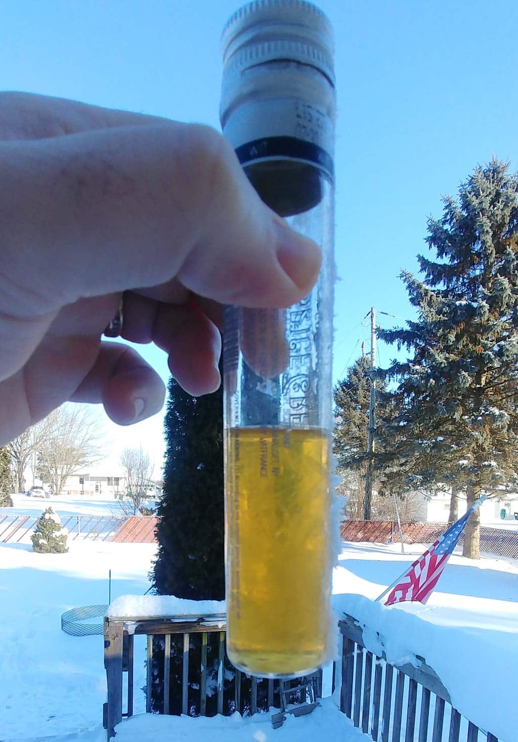 Once I moved the samples, I pretty much left them alone. At 5:00 pm, the temperature was -6°F with wind chill of -35°F. There was no change at that point. But, at 9:00 pm, the real temperature dropped to -12°F with wind chills at -37°F. Three of the samples looked the same, but the 80° Yahara Bay sample started getting thick.