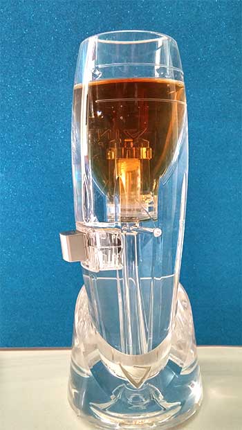 Another way to introduce air to your whiskey is via something called an aerator. Wine aficionados have been using aerators for a long time. It is a way to rapidly infuse the air with the wine, either by the bottle or just a glass. Because of the large volume of wine that goes into a single drink, you have to hold it directly over the glass as you pour from the bottle.