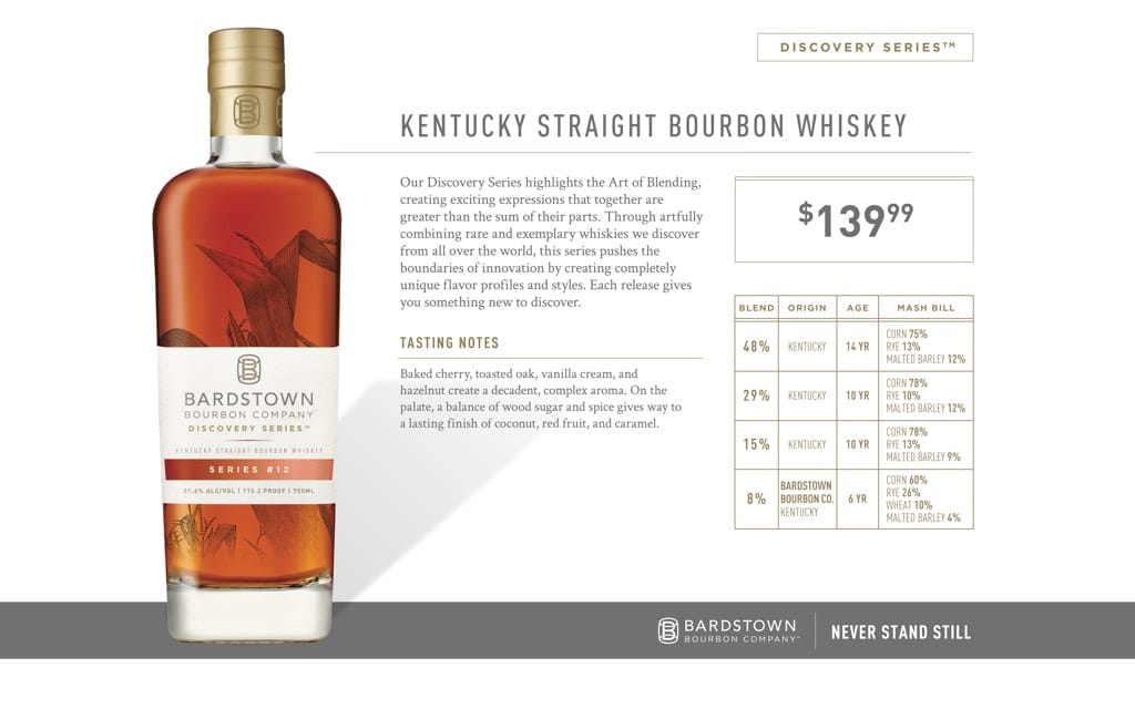 Discovery 12 is a thoughtfully blended collection of four whiskies, including a 6-year-old four grain recipe distilled and aged at Bardstown Bourbon Co. With each release, the Discovery series releases will include an increased percentage of Bardstown Bourbon’s estate distilled whiskies.