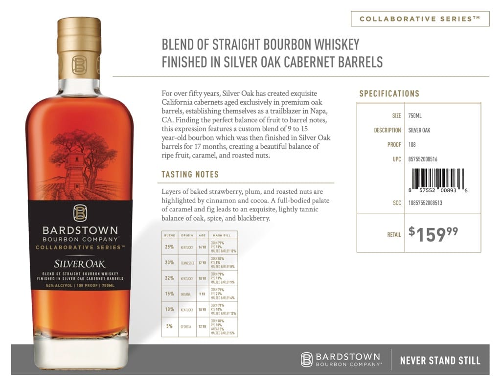 Bardstown Bourbon’s Silver Oak finish is presented at 108 proof (54% alc. by vol.) and is offered at a suggested retail price of $159.99.