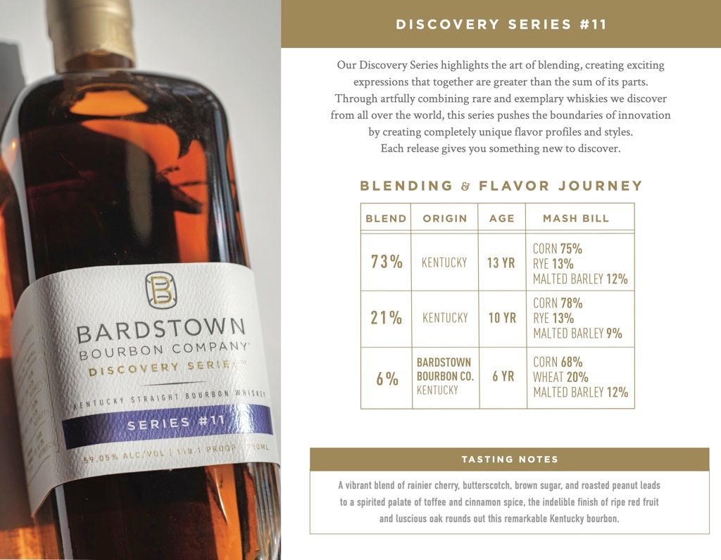 “This is a special milestone in our Discovery Series, as our own estate-distilled whiskey has now matured, which gives us some exciting new blending opportunities,” said Dan Callaway, VP of Product Development for Bardstown Bourbon Co. “So, for Discovery #11, we decided to celebrate in a Kentucky kind of way and chose all Bluegrass-based bourbons to blend with what we estate-distilled.”