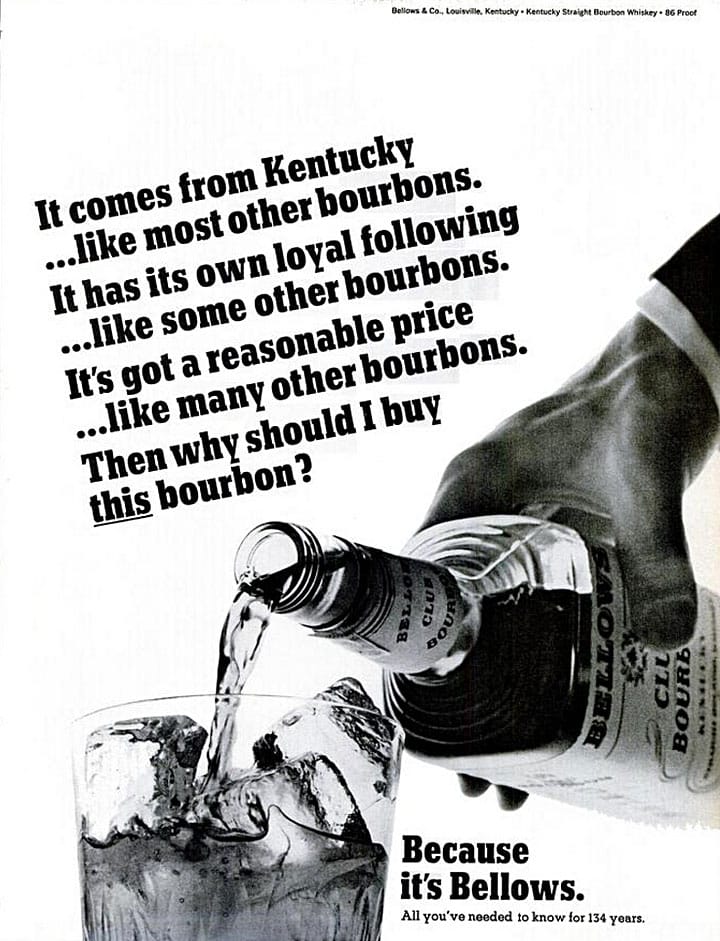 In 1965 this ad from Bellows Bourbon hit the local newsstand. Instead of relying on fancy photography, clever packaging or beautiful women, Bellow’s decided to rely on the pure appeal of their brand name and 134 years of experience. Good idea?