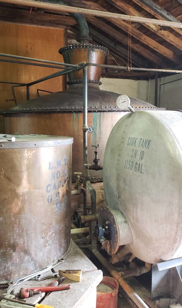 Our first stop was a large room just off the tasting room. This room holds the cook tank, the fermenter tanks, the Copper Pot Still, the Doubler and several copper holding tanks. The still itself was built in 1933, right at the end of prohibition. We were told that the still was used illegally for 20 years in Yonkers, New York to make Apple Jack Brandy. It became property of the federal government and when Chuck was putting his distillery together back in the late ‘80s, the still was discovered on federal land outside of Charlottesville, VA, covered in weeds and vines. The government donated the still to Belmont and it has been in operation ever since.