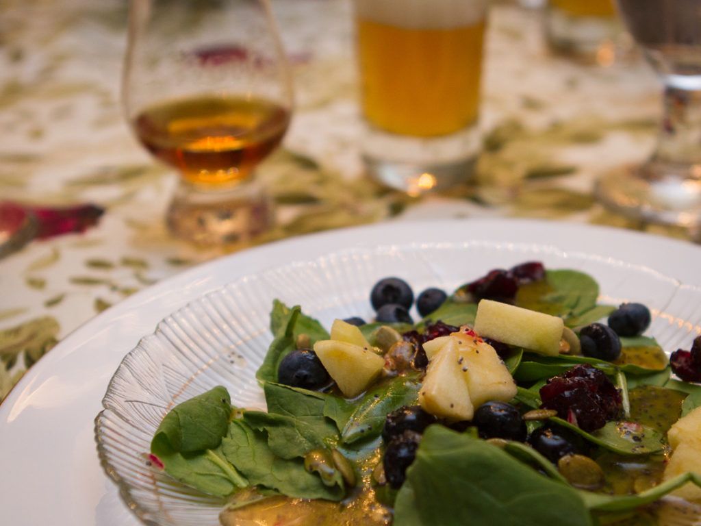 After mingling with our cocktails dinner began following the dinner menu created by my wife, each course paired with a different whiskey and beer combo.