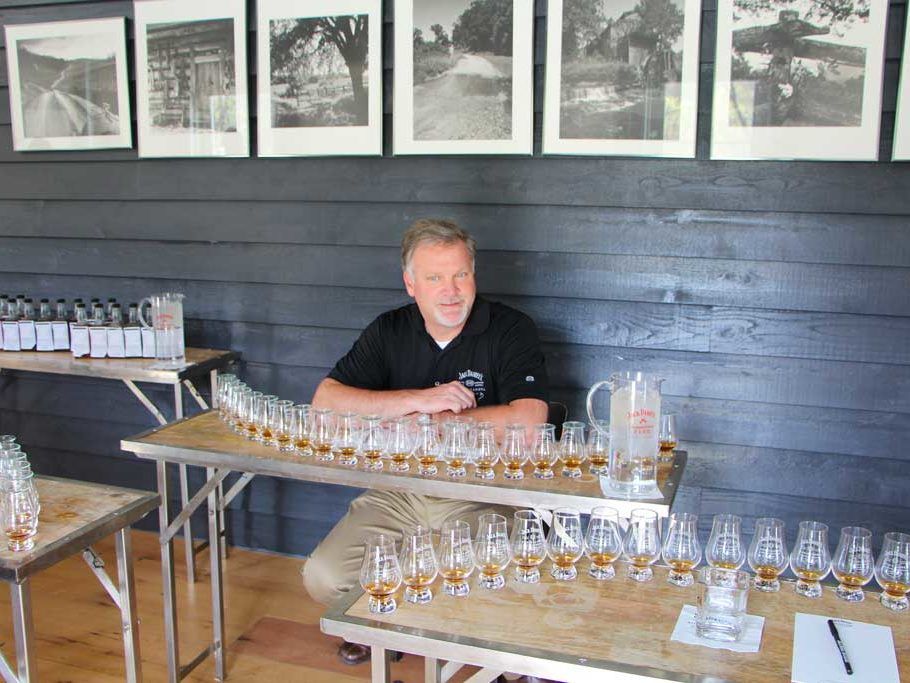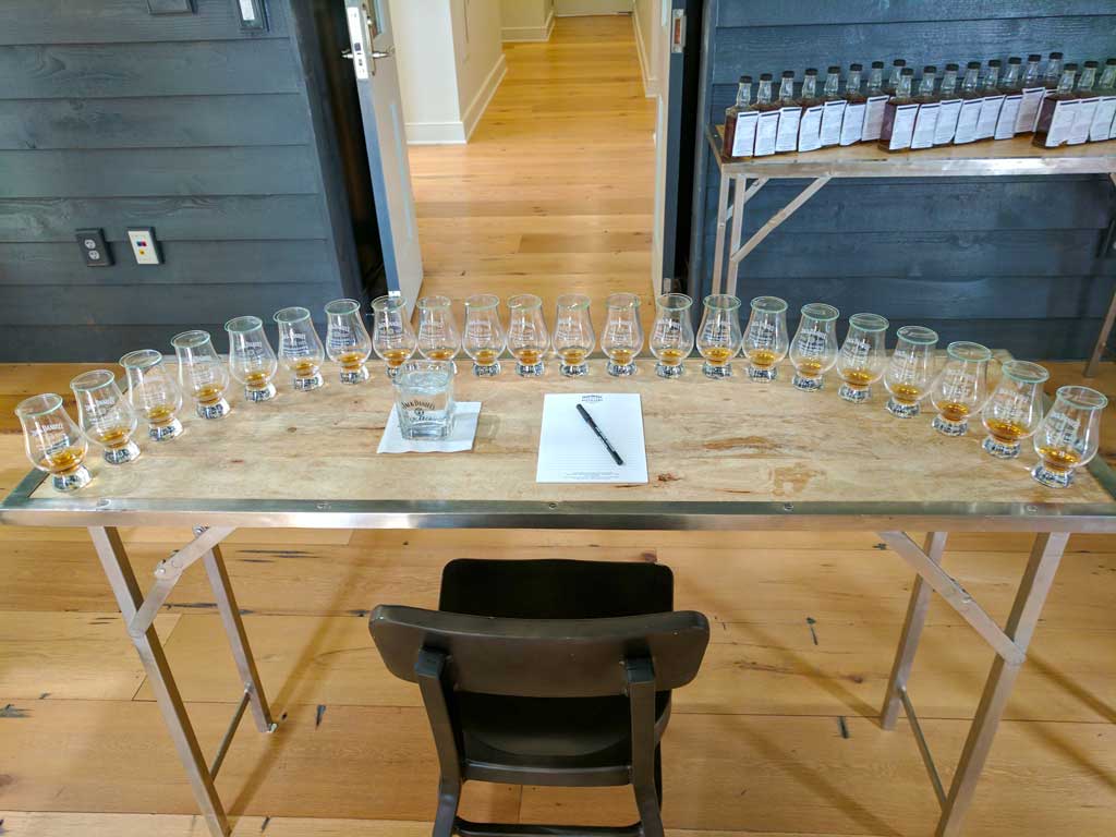 After a fabulous lunch at Miss Mary Bobo’s (do not miss it when visiting Lynchburg) and a VIP tour, we sat down with Jack Daniel’s Master Distiller Jeff Arnett to begin our selection process. We each sat down at a table with 22 samples, a glass of water, a notepad, and a pen. The samples were from barrels that had already been processed, filtered, and reduced to 94 proof.