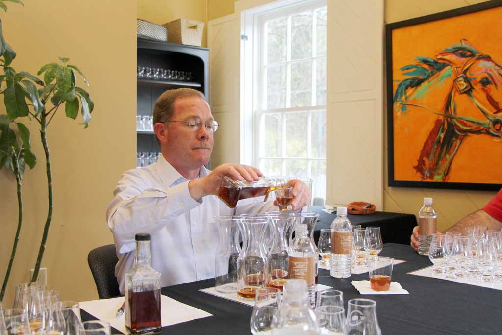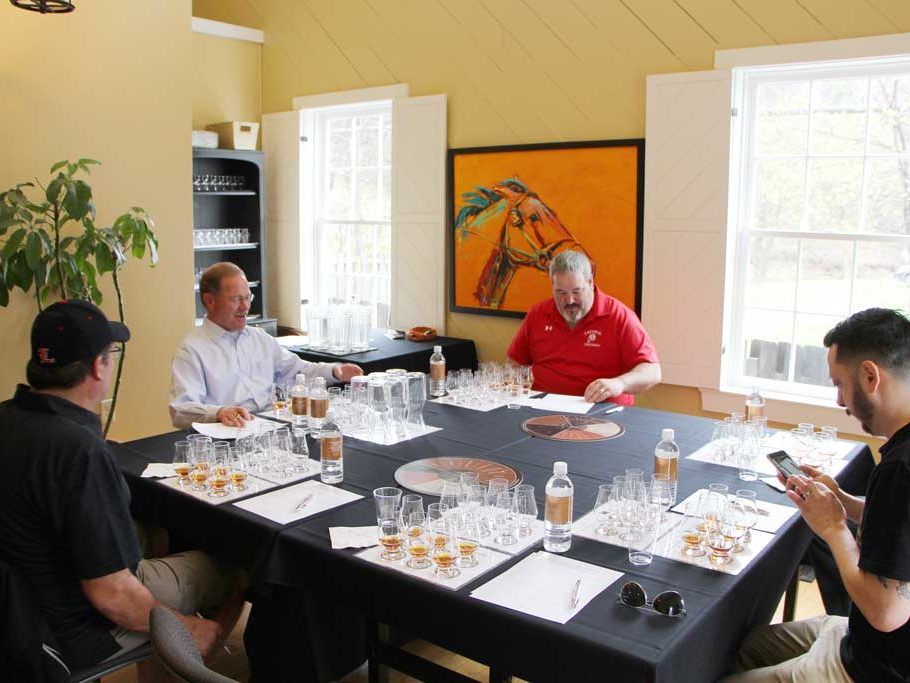 Our second distillery was Woodford Reserve. After lunch and a tour, which concluded with a reinvigorating sample straight from the barrel, we met with Brown-Forman’s Master Distiller Chris Morris who took us through the Personal Selection process. We learned you actually couldn’t get a single barrel of Woodford Reserve. Woodford uses heat cycling in their warehouse to make sure the aging process isn’t stopped when the weather gets too cold. The heat causes barrels to lose a little more to the angel’s share, thus lowering the yield on a single barrel. What the Woodford Reserve Distiller’s Select Personal Selection offers instead is the smallest batch bourbon: 2 barrel blends.