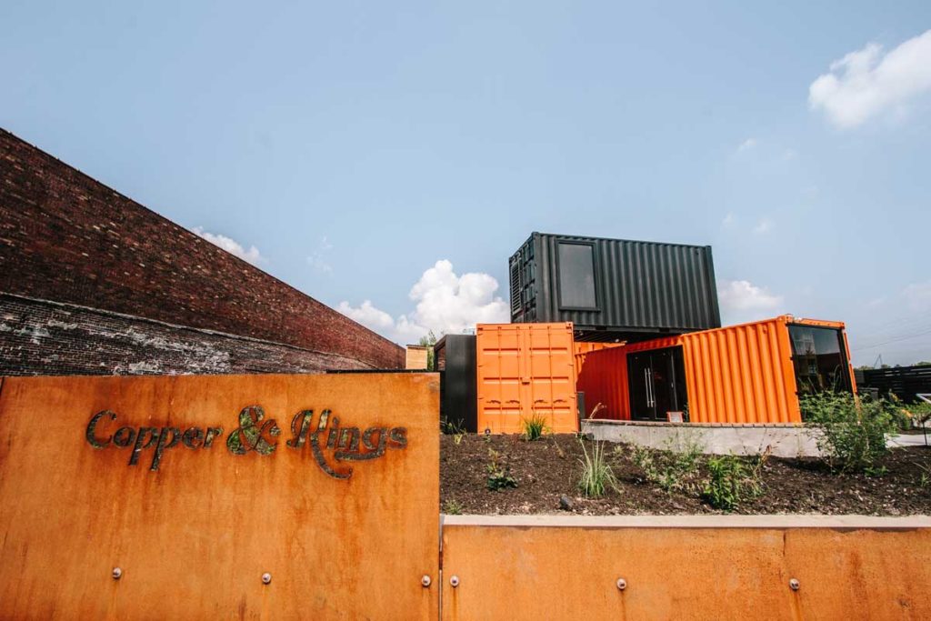 Arriving at Copper and Kings there is an impressive sense that this distillery seeks to be as much a destination, as a working distillery. You enter walking between a stack of reclaimed shipping containers. These make up their welcome center and gift shop, and into their wide-open patio, built for events. They have their three working pot stills, which are front and center, behind the 20 ft. High floor to ceiling windows at the entrance to the distillery.