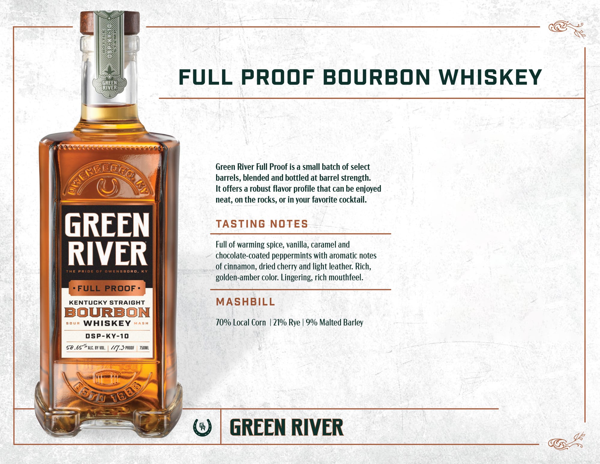 Green River Full Proof is a blend of five-to-seven-year barrels selected from curated areas of Green River’s Owensboro tile warehouses and feature the same mash bill as Green River Kentucky Straight Bourbon.