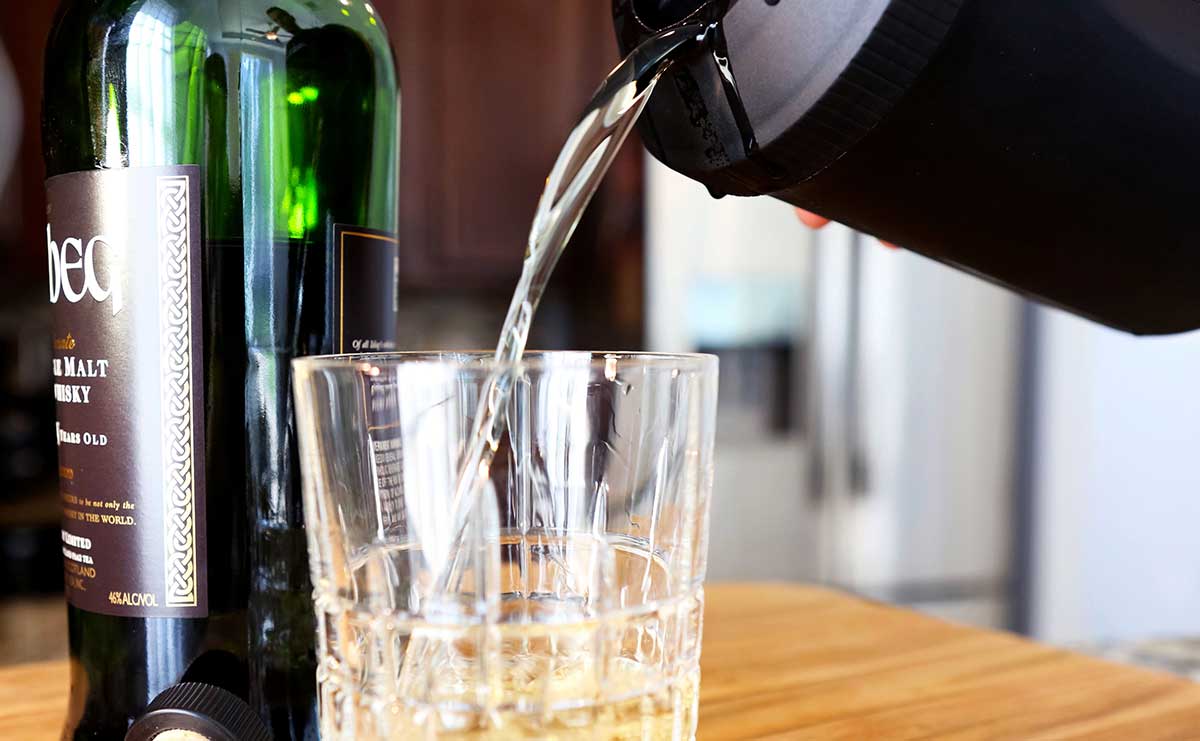 I poured two ounces of room temperature bourbon (for these purposes I tried two proofs: Basil Hayden 80 and E.H. Taylor Barrel Proof 129) into the chiller, waited for 90 seconds, the poured into a glass. The bourbon was cold, even the higher proof. The Basil Hayden at 80 proof was colder and didn’t require any water. As for the 129 proof barrel strength, I placed a few drops of water into the glass after it was chilled and this solved the dilution problem: I now have the exact amount of water I wanted, AND it’s cold!