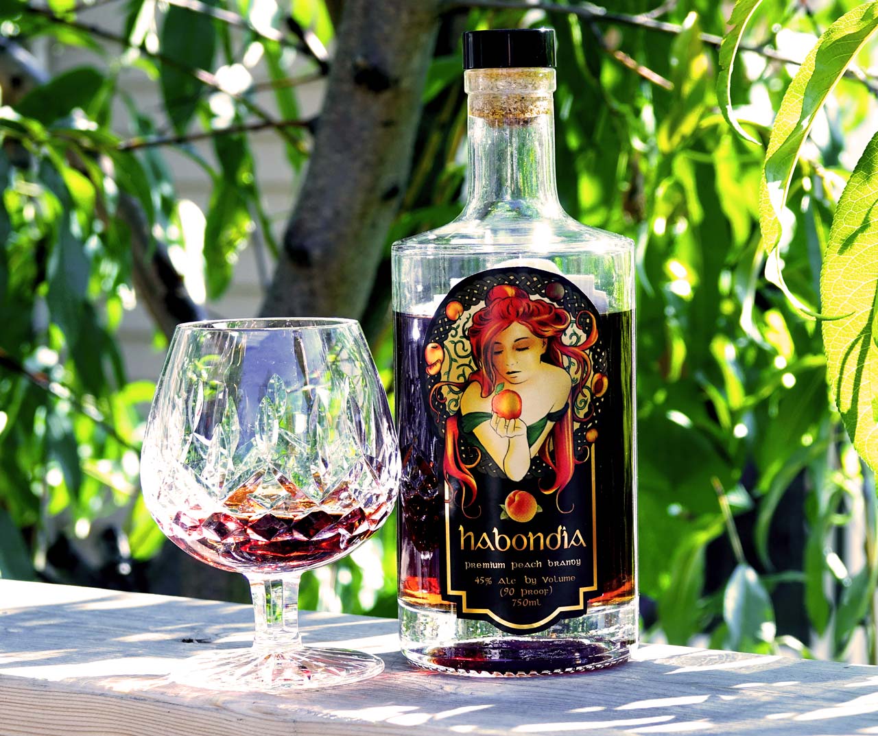 Habondia Peach Brandy is aged for six months in a white wine barrel, then for thirty months in a used, medium-toasted Missouri white oak barrel, for three years aging. As with the fresh ginger used for The Big O, the fresh peaches used are hand-chopped on-site at the distillery.