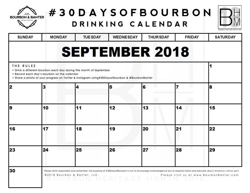 Download and print the #30DaysofBourbon calendar to keep track of your progress. Each day write down your bourbon and share a photo on Twitter/Instagram using #30DaysofBourbon and tag @BourbonBanter.