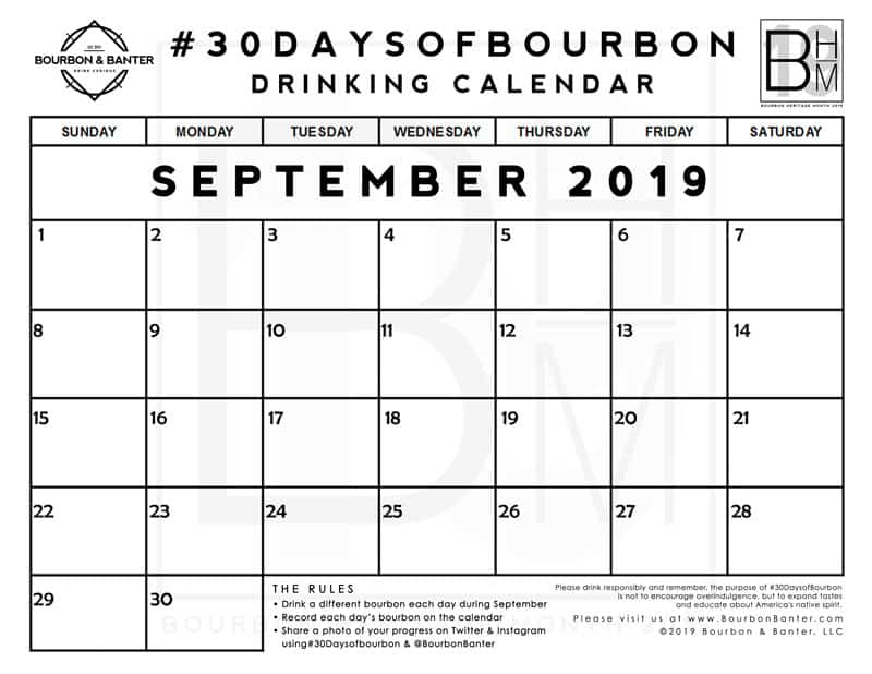 Download and print the #30DaysofBourbon calendar to keep track of your progress. Each day write down your bourbon and share a photo on Twitter/Instagram using #30DaysofBourbon and tag @BourbonBanter.