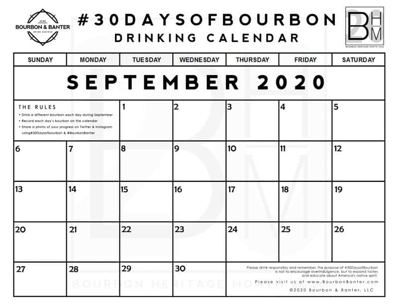 Download and print the 30 Days of Bourbon calendar to keep track of your progress. Each day write down your bourbon and share a photo on Twitter/Instagram using #30DaysofBourbon #BourbonHeritageMonth and tag @BourbonBanter.