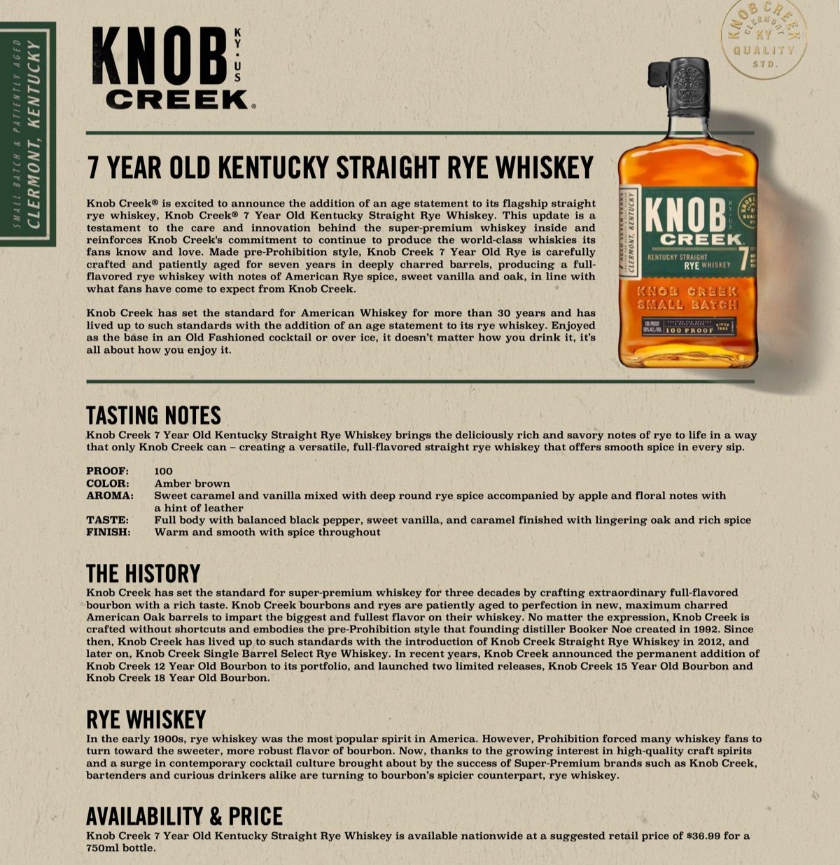 Knob Creek 7 Year Old Straight Rye Whiskey is now available nationwide with a suggested retail price of $36.99 for a 750mL bottle. For more information about Knob Creek 7 Year Old Straight Rye Whiskey and Knob Creek's award-winning* bourbon and rye portfolios, please visit www.KnobCreek.com or visit us on Instagram @KnobCreek.