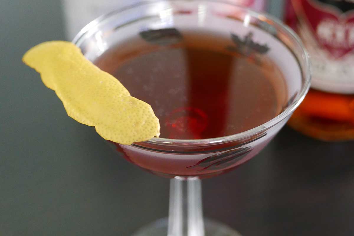 Stir whiskey, vermouth, and bitters over ice and strain into a chilled coupe. Twist lemon peel over the surface of the drink and rub along the rim of the glass.