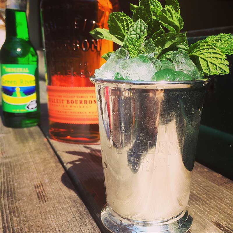 Preparation: Fill a julep cup with ice cubes to chill. Fill a clean towel with ice and smash the crap out of it to crush the ice. Discard the ice cubes from the cup and fill with the crushed ice. Fill cup 3/4 full with Chilled Chicago Green River Pre-Prohibition Soda. Top with Bulleit Bourbon and a generous bouquet of slapped mint. The carbonation will naturally rise since the bourbon is heavier and the drink will naturally mix. Cut your straw short so you smell the mint. (Optionally add a splash of maple syrup if you prefer your julep sweeter.)