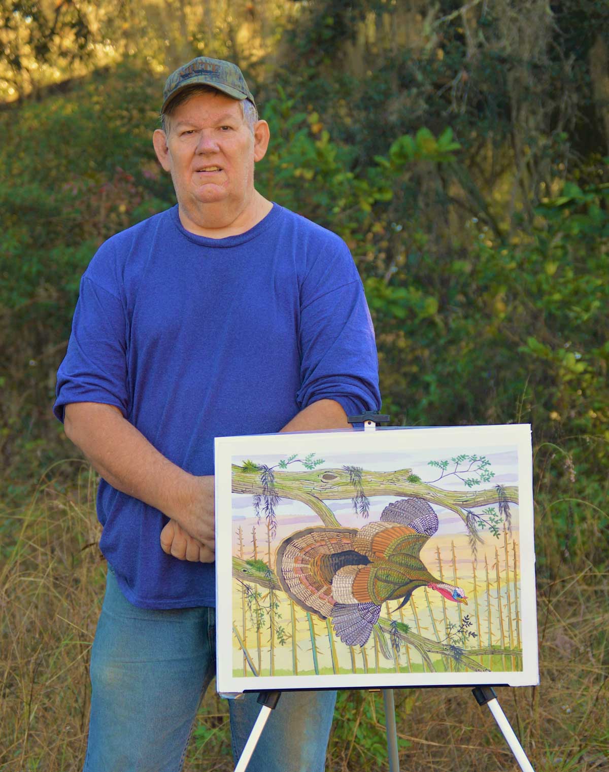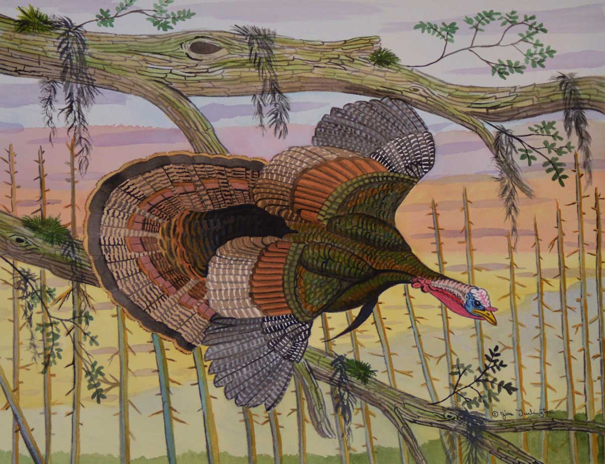 In late January of 2015, Jim Turlington began watching one particular Florida Osceola Wild turkey gobbler in a Central Florida oak hammock. Over a period of three months, observed, photographed and did a small field observation sketch of the gobbler . He even went so far as actually to climb up into the tree that the wild turkey had roosted in and took photos to use as reference for the watercolor painting he wanted to paint . In late April 2015, he finished the watercolor painting which he called ”Off the Roost”.