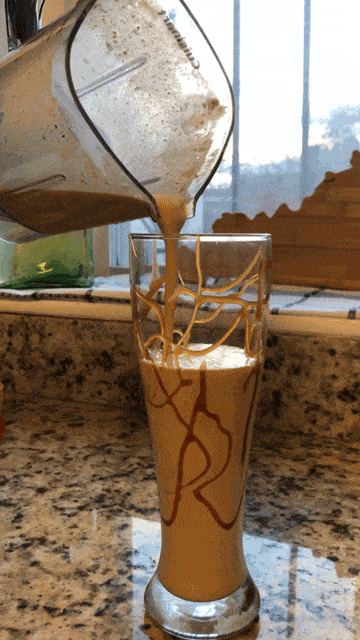 - Then pour some caramel on a small plate (it helps to microwave it for about 10 seconds), rim the glass in caramel, then dip in the graham cracker/speculoos. Pour in the milkshake.