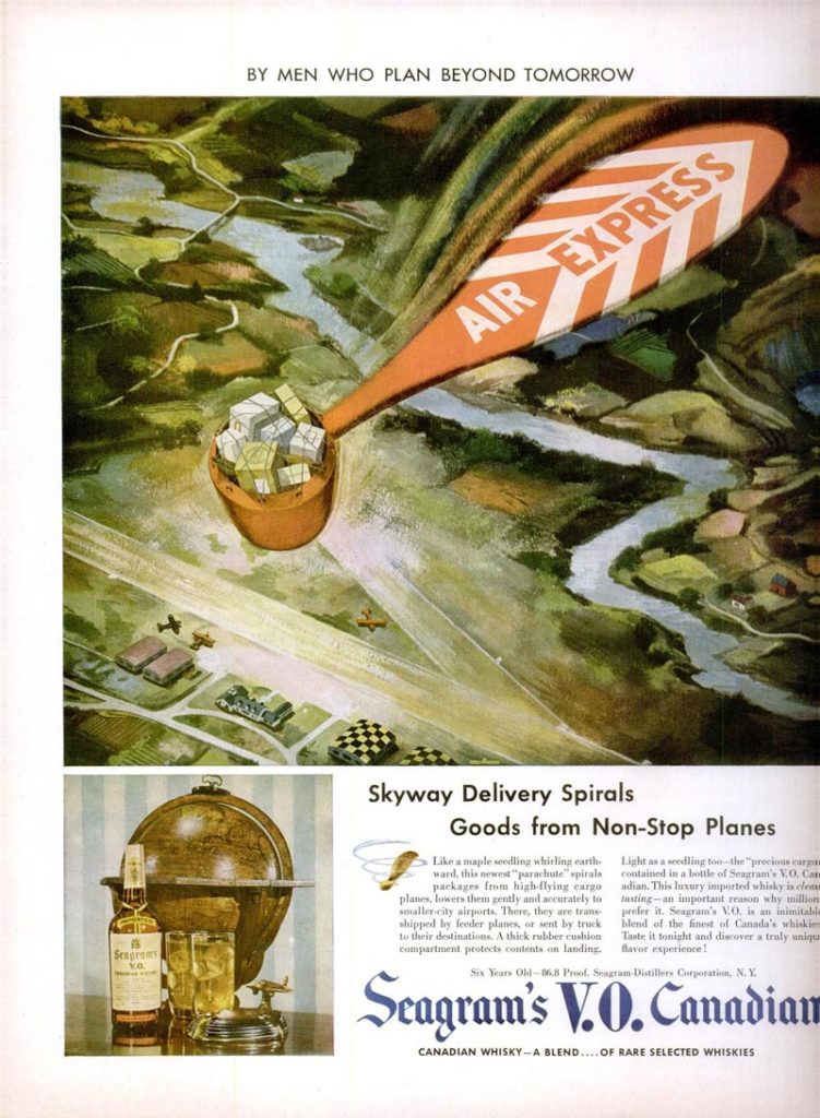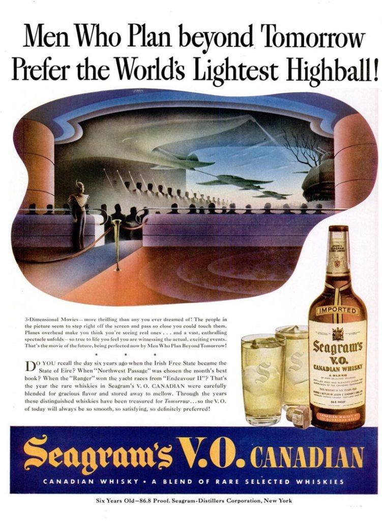 We at Bourbon and Banter love classic whisky advertising. A while ago, I stumbled across some pretty amazing Seagram’s ads from back in the 1940’s. These ads predict what the future may look like for the sophisticated Seagram’s drinker. Apparently they are men only…sorry, but it was the 1940’s.