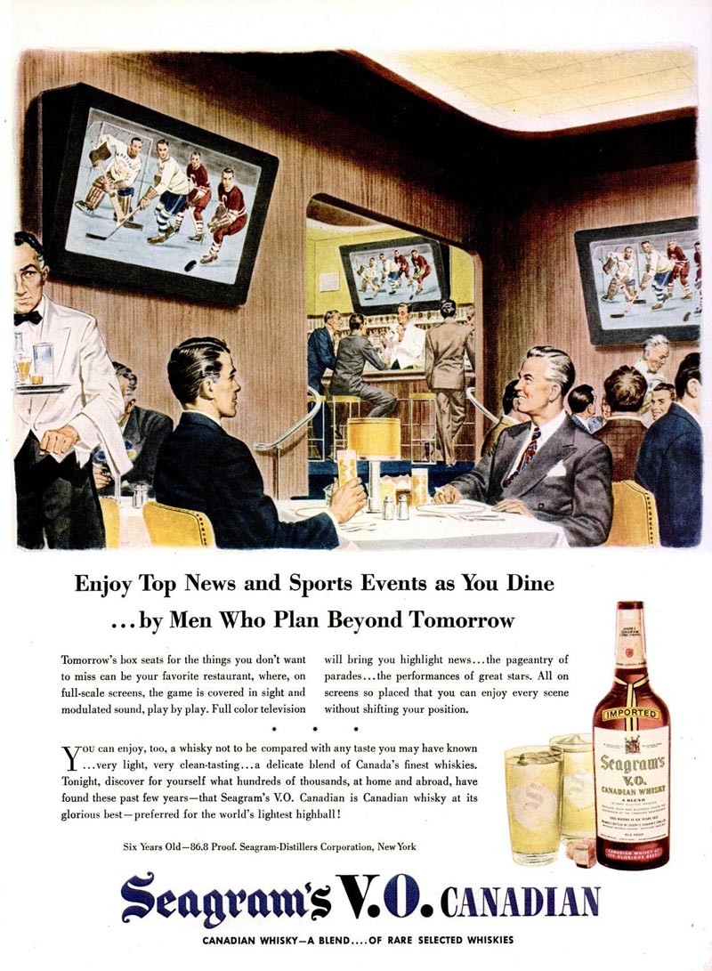 You have to love their early idea of sports bars. I cannot believe how right on they were with big screen, flat panel TV’s. Remember that television did not gain mass popularity until the ‘50’s. Perhaps as a liquor company like Seagram’s has good insight on how sports and whiskey go together. Seagram’s view appears more sedate and civilized than the sports bar I frequent. I have two big problems with their concept, male only and hockey? It was the ‘40’s, and I guess it is not surprising that a purveyor of Canadian Whisky chose to feature hockey.