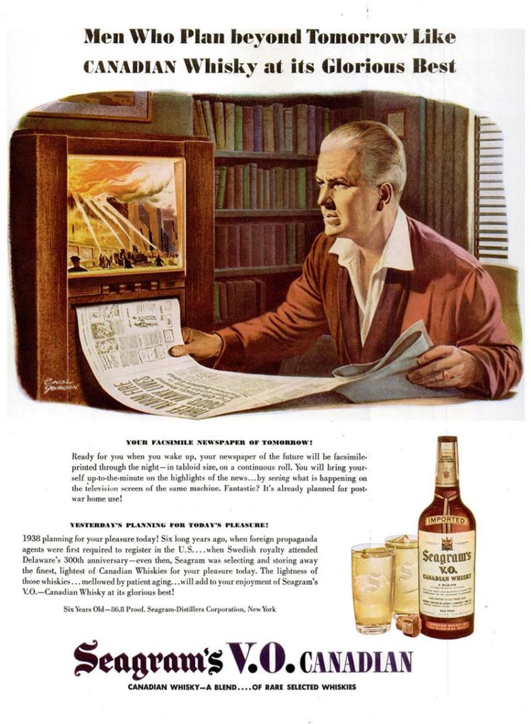We at Bourbon and Banter love classic whiskey ads. A while ago, I stumbled across some pretty amazing Seagram’s ads from back in the 1940’s. These ads predict what the future may look like for the sophisticated Seagram’s drinker. Apparently, they are men only…sorry, but it was the 1940’s. Many of the ads include fanciful stuff like atomic powered farms and vacuum tube power plants, and some are amazingly prophetic. This clearly shows that discriminating whiskey drinkers have always been the renascences thinkers of the new millennium.