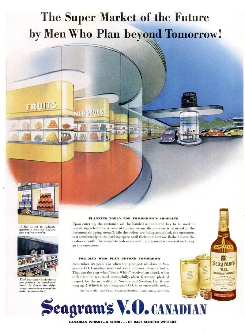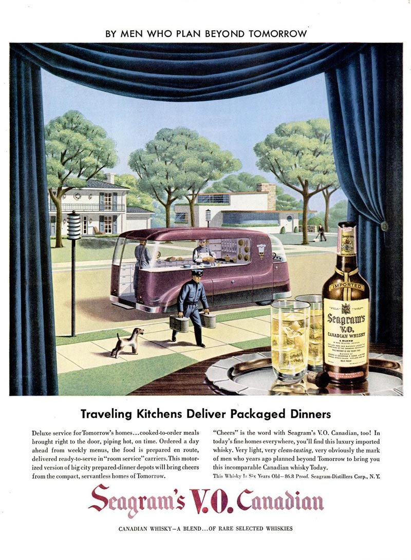 A few of the ads focus on food retail, which I guess makes sense for a spirit that is often enjoyed with meals. Between food trucks and home delivery grocery shopping, they pretty much got it right. The supermarket of the future includes cashless transactions and drive-in pickup. Today we call it “Click and Collect.” There is even a facsimile to internet shopping having them packed and delivered to you.