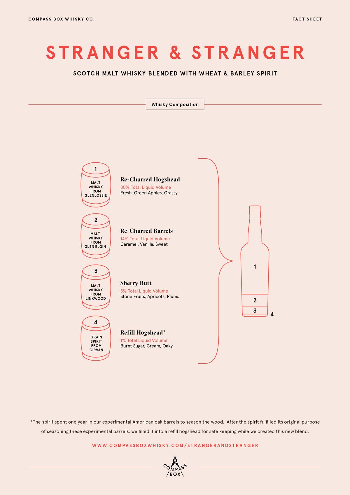 Stranger & Stranger is a blend of 80% Glenlossie malt aged in re-charred hogsheads, 14% Glen Elgin malt aged in re-charred barrels, 5% Linkwood malt aged in sherry butts, and 1% Girvan grain spirit aged for a year in refilled hogsheads. The latter spirit was first aged for a year in American oak then transferred to the used hogshead. Compass Box calls this a sacrificial spirit because it is what prevents this whisky being classified as Scotch as it is less than three years old.