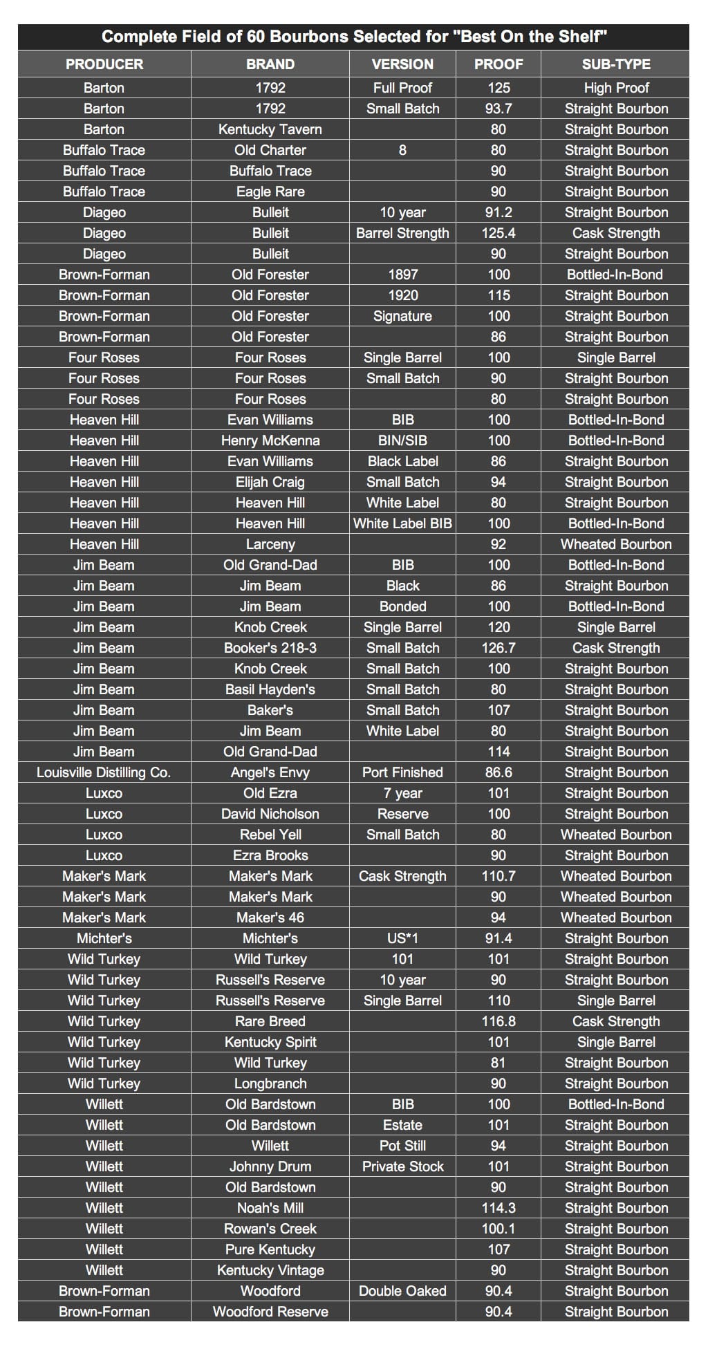 The field of 60 bourbons selected includes KDA members with national distribution. No store picks or limited editions were included. Single barrel picks and batch releases are tricky due to variation from year to year, but were included where they are readily available and represent a quality brand expression.