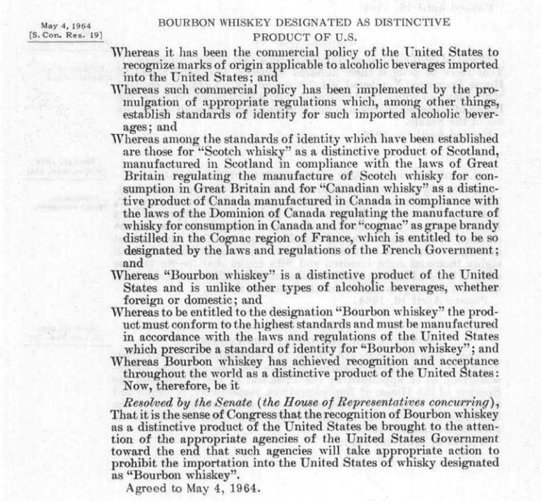On May 4, 1964, the United States Congress passed legislation that we can all agree was a wise move: the designation of Bourbon Whiskey as a uniquely American product and our country’s native spirit. The Senate Concurrent Resolution 19 (“Bourbon Whiskey Designated as Distinctive Product of U.S.”) is perhaps the only bit of legislation passed over the past half-century that every one of us – regardless of political camp – can rally behind. The designation was undoubtedly rooted in protectionist trade policy and economic politics, but it is one that solidified a uniquely American tradition of making and aging corn whiskey, a native grain of the United States.