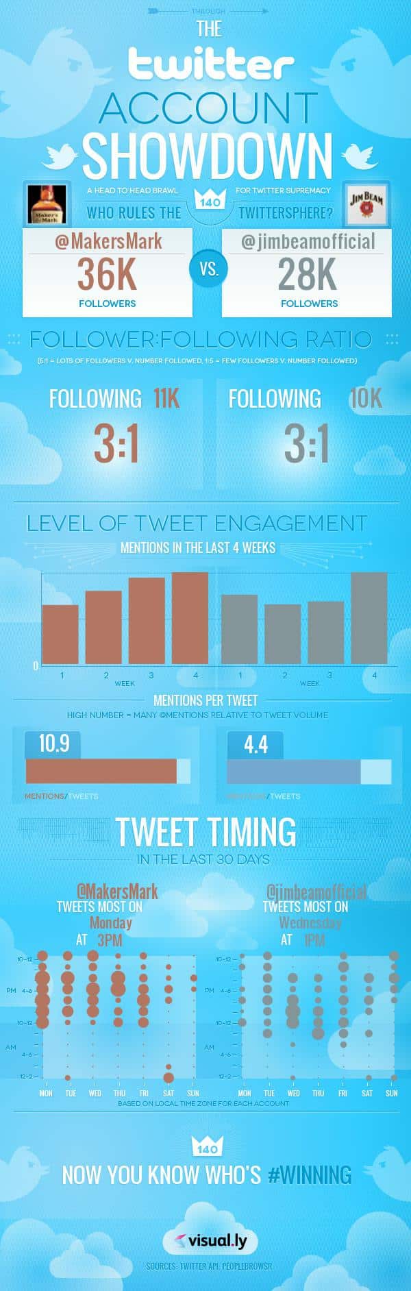 The infographic below shows how the two Twitter accounts compare to each other across several key measurements. As with our original Twitter showdown, it looks like Maker’s Mark comes out the winner again.