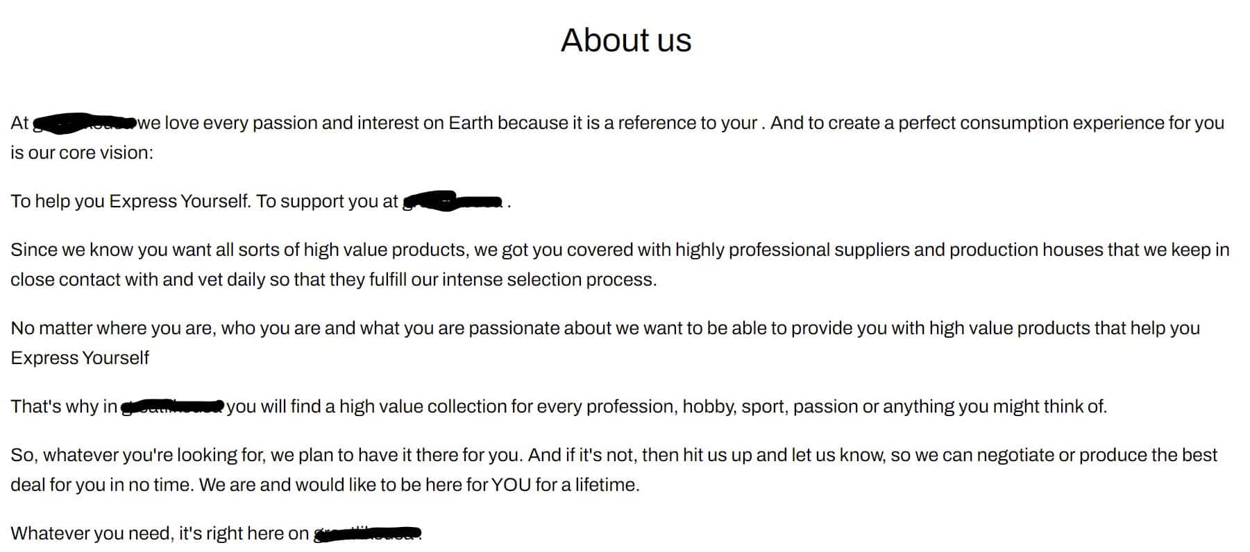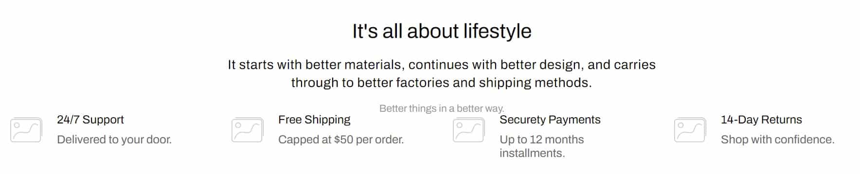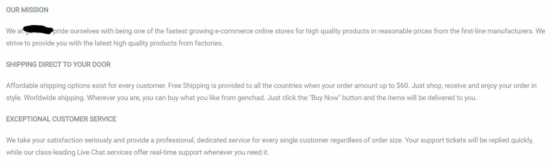 The second is great because they give a mission statement. Except it is a word salad that says nothing and means nothing (and to be fair, many legitimate companies have the same issue). Shipping Direct To Your Door is also cool. Look how carefully they go to convince you that they can ship! And, if you have a problem, don’t worry! “Your support tickets will be replied quickly.” Yeah, uh-huh, sure.