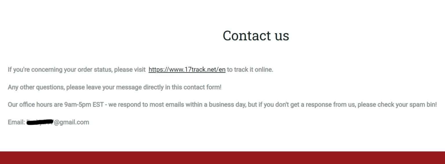 What’s wrong here? Aside from the horrific butchering of the language (“If you’re concerning your order status…” and “please check your spam bin!”), take a look-see at the second instruction. Go ahead, fill out the contact form. What’s that? You can’t find one? BINGO!