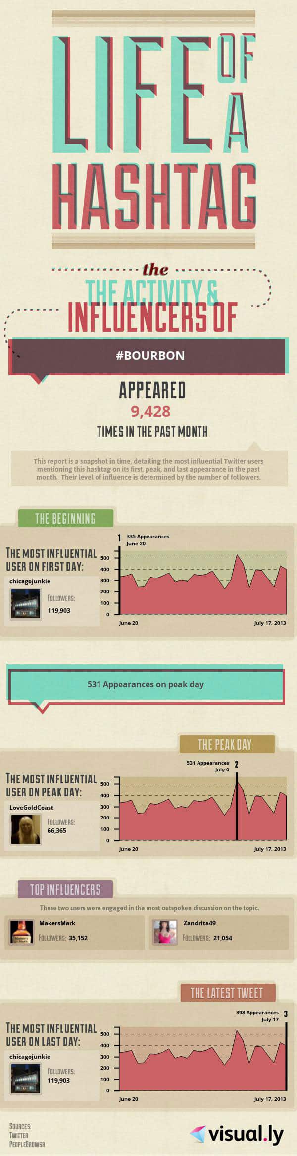 Woke up this morning in the mood to look at some data. Not just any data mind you, bourbon data. More specifically, bourbon data on Twitter. It’s been roughly 4 months since we last reported on how the hashtag #bourbon was trending on Twitter, so today should be a real treat for those of you who care about things like this. For those of you who are less inclined to worry about such things you might be interested in one of the folks listed in the bourbon infographic below. (Let’s just say her Twitter feed is on the adult side of things.)